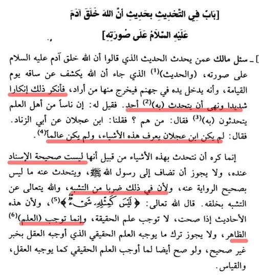 – سئل مالك عمن يحدث الحديث الذي قالوا أن الله خلق آدم عليه السلام على صورته، (والحديث) الذي جاء أن الله يكشف عن ساقه يوم القيامة، وأنه يدخل يده في جهنم فيخرج منها من أراد، فأنكر ذلك إنكارا شديدا ونهى أن يتحدث (به) أحد. فقيل له : إن ناساً من أهل العلم يتحدثون (به) فقال: من هم ؟ فقلنا : ابن عجلان عن أبي الزناد.