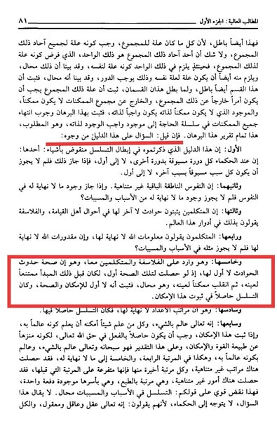 وعدد اعتراضاتهم حتى قال: ” وخامسها، وهو وارد على الفلاسفة والمتكلمين معا وهو إن صحة حدوث الحوادث لا أول لها ، إذ لو حصلت لتلك الصحة أول ، لكان قبل ذلك المبدأ ممتنعا لعينه ثم انقلب ممكنا لعينه وهو محال فثبت انه لا أول للإمكان والصحة، وكان التسلسل حاصلا في ثبوت هذا الامكان”. انتهى