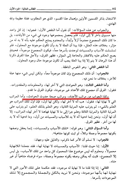 ومع أن الفخر الرازي قام بعد ذلك بالجواب على تلك الاعتراضات بقوله: ” والجواب على هذه التساؤلات، أما النقض الأول فجوابه…….وكذا الجواب عن مراتب الأعداد، ومراتب صحة حدوث الحوادث….”. انتهى