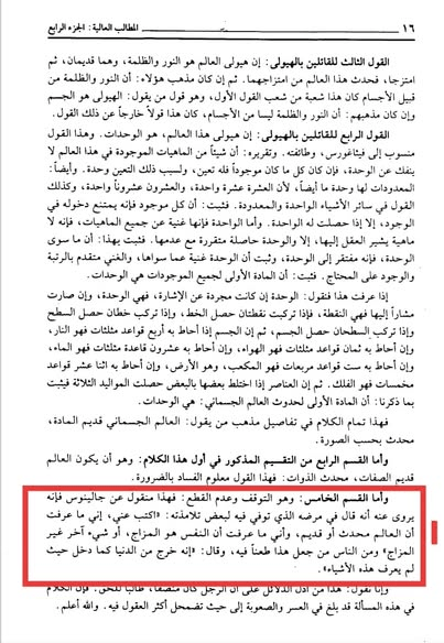 وبالرجوع إلى المطالب العالية نجد أن ما نسبه ابن تيمية للإمام الرازي هو في الأصل ما نسبه الإمام فخر الدين لجالينوس الذي قال في مرض موته: “اكتب عني أني ما عرفت أن العالَم محدَثٌ أو قديم”. انتهى