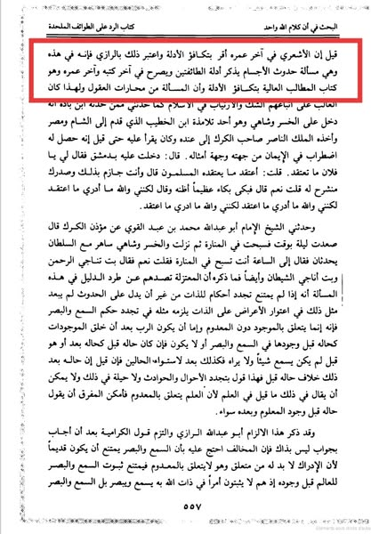 ثانيا: لا يسلم بصحة نسبة هذا الكلام للرازي، ففي بعض النسخ تحريف واضح و من يراجع نسخة هامش هذا الكلام يجد أنه مكتوب تحته على الهامش قبل كلمة: (وأنا أقول) ما نصه : “في (و) أي النسخة الثانية واو : الكرامية: قال الداعي إلى الله : وأنا أقول … الخ” . انتهى