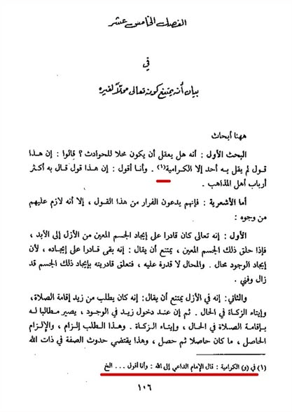 ” البحث الأول : أنه هل يعقل أن يكون – يعني الله – محلا للحوادث ؟ قالوا : إن هذا قول لم يقل به أحد إلا الكرَّامية . وأنا أقول:” إن هذا قول قال به أكثر أرباب المذاهب: أما الأشعرية, فإنهم يدَّعون الفرار من هذا القول ، إلا أنه لازم عليهم من وجوه: الأول : أنه تعالى كان قادرا على إيجاد الجسم المعين من الأزل إلى الأبد ؛ فإذا خلق الجسم المعين ، يمتنع أن يقال: إنه بقي قادرا على إيجاده؛ لأن إيجاد الموجود محال، والمحال لا قدرة عليه ، فتعلُّق قادريته بإيجاد ذلك الجسم قد زال وفني”. انتهى