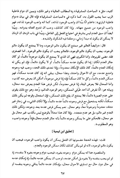 وأيضًا العالم غير ممتنع أن يكون دائم الوجود، وما لم يمتنع أن يكون دائم الوجود يكون دائم الوجود، فالعالم يجب أن يكون دائم الوجود”. انتهى.