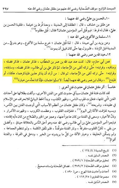 وأما ما رواه النسائي في سننه، قال : “أخبرني هلال بن العلاء بن هلال قال حدثنا حسين قال حدثنا زهير عن أبي إسحاق عن العلاء بن عرار قال سألت عبد الله بن عمر قلت ألا تحدثني عن علي وعثمان قال أما علي فهذا بيته من بيت رسول الله صلى الله عليه وسلم ولا أحدثك عنه بغيره وأما عثمان فإنه أذنب يوم أحد ذنبا عظيما فعفا الله عنه وأذنب فيكم صغيرا فقتلتموه”. انتهى