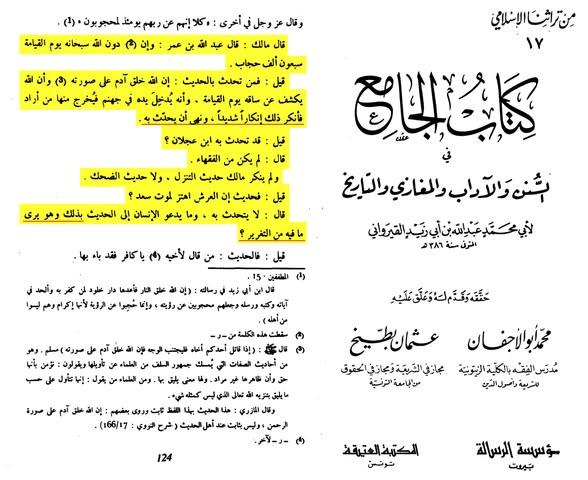 نقل الإمام ابن أبي زيد رحمه الله تعالى في كتابه النوادر والزيادات المجلد 14/ 553 عن الإمام مالك أنه قال: “ولا ينبغي لأحد أن يصف الله تعالى إلا بما وصف به نفسه، ولا يشبهه كذلك بشيء، وليقل: له – تعالى – يدان كما وصف به نفسه، وله وجه كما وصف به نفسه. تقف عند ما في الكتاب، لأن الله سبحانه لا مثل له ولا شبيه له ولا نظير له، ولا يروي أحدٌ مثلَ هذه الأحاديث، مثلُ ” إن الله خلق آدم على صورته ” ونحوُ ذلك مـن الأحاديث. وأعظمَ مالكٌ أن يتحدث أحدٌ بمثل هذه الأحاديث أو يُردِّدَها”. انتهى