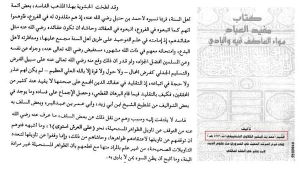 ومما يدل على أن هذه الكلمة قد تكون مدسوسة عليه قوله في كتابه الجامع في الصحيفة 139 – 141 :” مما اجتمعت الأئمة عليه من أمور الديانة ومن السنن التي خلافها بدعة وضلالة أن الله تبارك وتعالى فوق سماواته على عرشه دون أرضه وإنه في كل مكان بعلمه”. حيث أنه لم يقل: ” فوق سماواته على عرشه بذاته”.