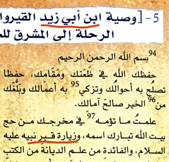 تجدون مرفقا مقتطفات من وصية الإمام ابن أبي زيد القيرواني – الصورة الثانية والثالثة- ذكرت في ذيل مخطوطة كتابه الذب عن الإمام مالك ونشرت في مجلة، وفيها اقراره لتلميذَه على شده الرحالَ لزيارة قبر النبي صلى الله عليه وسلم، وهذا النص يجعل ابن أبي زيد القيرواني في حكم القبورية عند أدعياء السلفية.