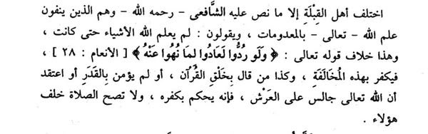 قال رحمه الله في التعليقة: “فيكفر بهذه المخالفة، وكذا من قال بخلق القرآن – أي من قال أن كلام الله الذي هو صفة ذاته مخلوق – أو لم يؤمن بالقدر أو اعتقد أن الله تعالى جالس على العرش فإنه يحكم بكفره و لا تصح الصلاة خلف هؤلاء”. انتهى