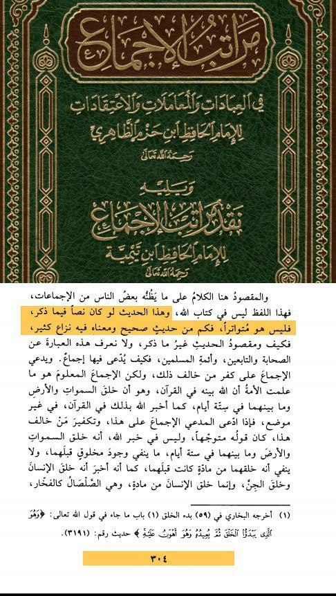 قال ابن تيمية في نقد مراتب الاجماع: “وأعجب من ذلك حكايته – أي ابن حزم- الإجماع على كفر من نازع أنه سبحانه ” لم يزل وحده، ولا شيء غيره معه، ثم خلق الأشياء كما شاء “. ومعلوم أن هذه العبارة ليست في كتاب الله، ولا تنسب إلى رسول الله صلى الله عليه وسلم، بل الذي في ” الصحيح ” عنه حديث عمران بن حصين رضي الله عنه عن النبي صلى الله عليه وسلم: ” كان الله ولا شيء قبله، وكان عرشه على الماء، وكتب في الذكر كل شيء، وخلق السموات والأرض “