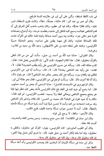 فالحاصل ما قدمناه فى ترجمة الكرابيسى من أن أحمد ابن حنبل وغيره من السادات الموفقين نهوا عن الكلام فى القرآن جملة وإن لم يخالفوا فى مسألة اللفظ فيما نظنه فيهم إجلالا لهم وفهما من كلامهم فى غير رواية ورفعا لمحلهم عن قول لا يشهد له معقول ولا منقول ومن أن الكرابيسى والبخارى وغيرهما من الأئمة الموفقين أيضا أفصحوا بأن لفظهم مخلوق لما احتاجوا إلى الإفصاح هذا إن ثبت عنهم الإفصاح بهذا وإلا فقد نقلنا لك قول البخارى أن من نقل عنه هذا فقد كذب عليه”. انتهى