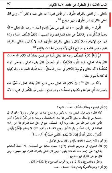 – و قال الإمام الكوثري في الرد على النونية في الصحيفة 172 ما نصه: “بل من قال إن كلام معبوده حرف وصوت قائمان به فهو الذي نحت عجلاً جسداً له خوار, يحمل أشياعه على تعبّده”. انتهى