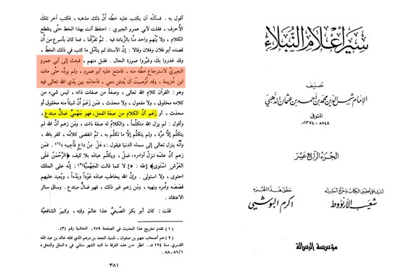 – و قال الامام المجتهد ابو ثور ابراهيم بن خالد المتوفى سنة 240 هجري ما نصه: “من قال إن كلام الله – اي المعنى القائم به- سبحانه مخلوق فقد كفر وزعم ان الله عز و جل حدث فيه شىء لم يكن”. انتهى رواه اللالكائي في الفصل المعقود لذكر اعتقاد ابي ثور وهو تصريح بتكفير من نسب قيام الحروف و الأصوات بالله تعالى.