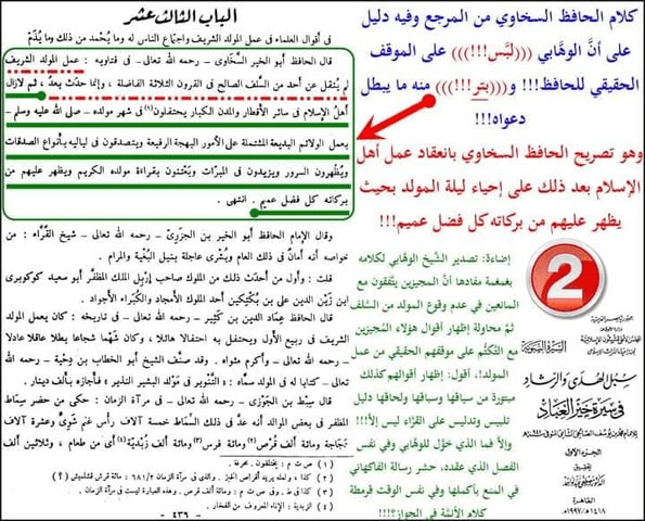 وأما في الوثيقة رقم 2 فنجد : كلام الـحافظ السخاوي من الـمرجع نفسه وفيه دليل على أنَّ إسماعيل الأنصاري لبَّس على الموقف الحقيقي للحافظ، و بتر منه ما يبطل دعواه. وهو تصريح الحافظ السخاوي بانعقاد عمل أهل الإسلام بعد ذلك على إحياء ليلة الـمولد بحيث يظهر عليهم من بركاته كل فضل عميم.