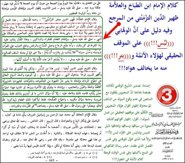 وفي الوثيقة رقم 3: نجد كلام الإمام ابن الطباخ والعلاَّمة ظهير الدِّين التزْمَنْتي من الـمرجع وفيه دليل على أنَّ هذا الوهَّابي لبَّس أيضا على الموقف الحقيقي لهؤلاء الأئمَّة وبتر منه ما يخالف هواه.