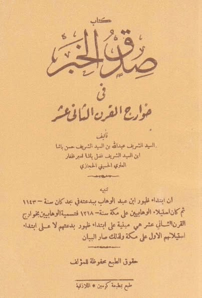 جاء في كتاب فتنة الوهابية و أحوال نجد للشيخ عبد الوهاب بن محمد بن حميدان بن تركي الحنبلي الخالدي المتوفى سنة 1258 هجري، ما نصه : في سنة 1150 هـ ألف ومائة وخمسين، ظهور محمد بن عبد الوهاب بن مشرف التميمي في بلد العيينة من عارض اليمامة في وادي مسيلمة وتكفيره الأمة المحمدية بزخرفة من القول، واستدلاله عليهم بظواهر آيات نزلت في الكفار واليهود، وأحاديث مؤولة كادعائه أن من قال يا رسول الله اشفع لي، فهو كافر، ومن ترك ركنا من أركان الإسلام، فهو كافر إلى أن دعاه هواه إلى تكفير خواص الأمة من حملة الشريعة أهل الورع والإتقان لأجل عدم موافقتهم على ما هو عليه من الابتداع”. انتهى