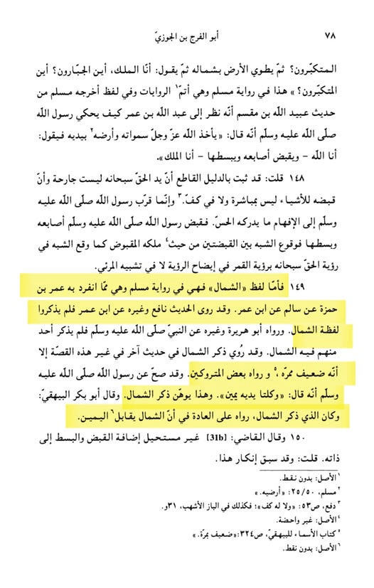 – تعليق الوهابي عبد العزيز بن باز على كتاب التوحيد، حيث قال: “وفي هذا إثبات الصفات وأنه سبحانه له يمين وشمال وأن كلتا يديه يمين كما في الحديث الآخر”. انتهى