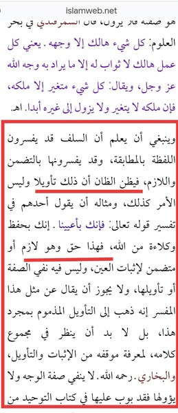 – قال ابن عثيمين في تعليقه على لمعة الاعتقاد: ” الواجب في نصوص الكتاب والسنة إبقاء دلالتها على ظاهرها من غير تغيير، لأن الله أنزل القرآن بلسان عربي مبين… ولأن تغييرها عن ظاهرها قول على الله بلا علم وهو حرام.. مثال ذلك قوله تعالى: بَلْ يَدَاهُ مَبْسُوطَتَانِ يُنفِقُ كَيْفَ يَشَاءُ -المائدة: 64- فإن ظاهر الآية أن لله يدين حقيقتين فيجب إثبات ذلك له، فإذا قال قائل: المراد بهما القوة، قلنا له: هذا صرف للكلام عن ظاهره فلا يجوز القول به، لأنه قول على الله بلا علم. انتهـى