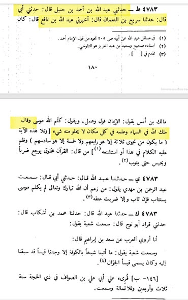 ورد في كتاب العلل ومعرفة الرجال للإمام أحمد بن حنبل ما نصه: “حدثِنِي عَبْدُ اللَّهِ بْنُ أَحْمَدَ بْنِ حَنْبَل قَالَ حَدَّثَنِي أَبِي قَالَ حَدثنا سريح بن النُّعْمَانِ قَالَ أَخبرني عبد الله بن نَافِعٍ قَالَ كَانَ مَالك بن أنس يَقُولُ الْإِيمَانِ قَول وعمل وَيَقُول كلم الله مُوسَى وَقَالَ ملك الله فِي السَّمَاء وعلمه في كل مكان”. انتهى