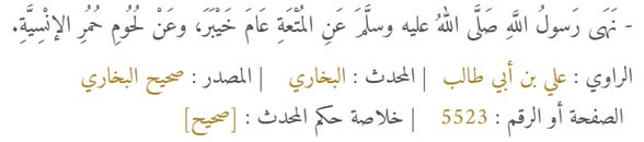 وهذا البخاري أيضا عقد في صحيحه تحت كتاب النكاح، بابا سماه نهي رسول الله صلى الله عليه وسلم عن نكاح المتعة أخيرًا، وروى عن علي بن أبي طالب رضي الله عنهم أن رسول الله صلى الله عليه وسلم نهى عن متعة النساء يوم خيبر، وعن لحوم الحُمُر الأهلية.