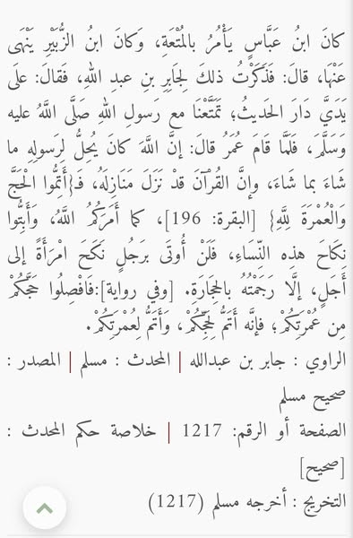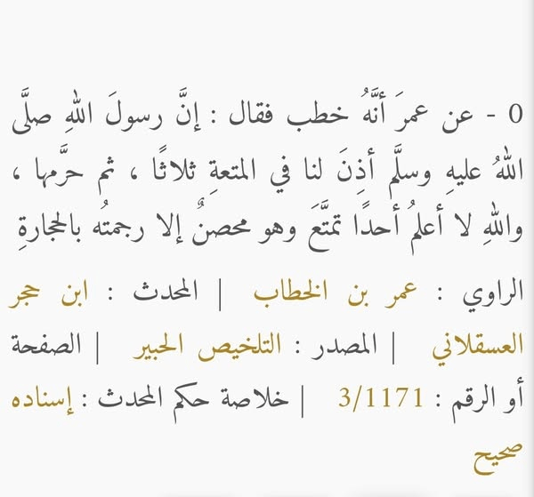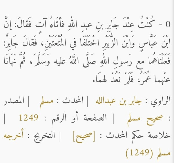 والنهي أكده أيضا عمر الفاروق، فقد ورد في صحيح مسلم في هذا السّياق:” حدثنا محمد بن المثنى وابن بشار قال ابن المثنى حدثنا محمد بن جعفر حدثنا شعبة قال سمعت قتادة يحدث عن أبي نضرة قال كان ابن عباس يامر بالمتعة وكان ابن الزبير ينهى عنها قال فذكرت ذلك لجابر بن عبد الله فقال على يدي دار الحديث تمتعنا مع رسول الله صلى الله عليه وسلم فلما قام عمر قال إن الله كان يحل لرسوله ما شاء بما شاء وإن القرآن قد نزل منازله ف أتموا الحج والعمرة لله كما أمركم الله وأبتوا نكاح هذه النّساء فلن أوتى برجل نكح أمراًة إلى أجل إلا رجمته بالحجارة وحدثنيه زهير بن حرب حدثنا عفان حدثنا همام حدثنا قتادة بهذا الإسناد وقال في الحديث فافصلوا حجكم من عمرتكم فإنه أتم لحجكم وأتم لعمرتكم”. انتهى