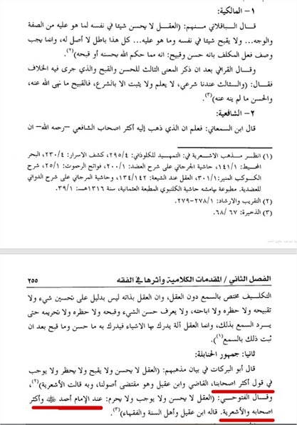 وقال المرداوي الحنبلي في التحبير: “ذهب الحنابلة والأشعرية إلى أن التحسين والتقبيح شرعيان، وذهب الشيخ – يعني ابن تيمية – والمعتزلة إلى أنهما عقليان”. انتهى.