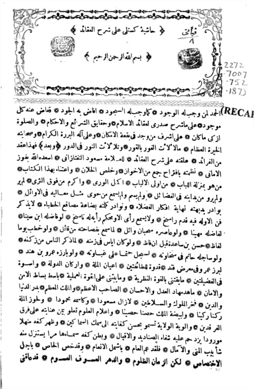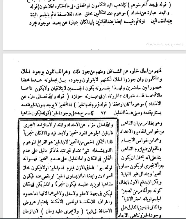 ب- قال الكستلي في حاشيته على شرح العقائد للتفتازاني ما نصه: ( قوله فى بعد آخر متوهم ) كما ذهب اليه المتكلمونَ او متحقق على ما اختاره افلاطون ( قوله و البعد عبارة عن امتداد ) موهوم عند المتكلمين محقق عند الفلاسفة، قائم بالجسم البتة عند المشائين او قائم بنفسه ايضا عند القائلين بان المكان عبارة عن بعد موجود مجرد. فمنهم من أحال خلوه عن الشاغل ومنهم من جوز ذلك وهم القائلون بوجود الخلاء “. انتهى