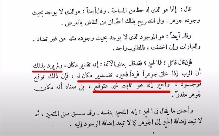 ج- قال البيجوري في حاشيته على جوهرة التوحيد: ” والمراد بالمكان، الفراغ الموهوم على رأي المتكلمين، والمحقق في راي الحكماء، ومعنى كونه موهوماً عند المتكلمين أنه يُتوهم أنه أمر وجودي وليس كذلك، بل هو أمر عدمي. وقيل معنى كونه موهوما أنه يتوهم أنه فراغ وليس كذلك، بل هو مملوء بالهواء فليس فراغا محققا”. انتهى