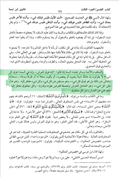 العجيب أن ابن تيمية نفسه صرح في تفسيره لسورة الأعلى بأن العرش ليس محلا ولا ظرفا لله عز وجل حيث قال: “والسلف والأئمة وسائر علماء السنة إذا قالوا ” إنه فوق العرش وإنه في السماء فوق كل شيء ” لا يقولون إن هناك شيئا يحويه أو يحصره أو يكون محلا له أو ظرفا ووعاء سبحانه وتعالى عن ذلك بل هو فوق كل شيء وهو مستغن عن كل شيء وكل شيء مفتقر إليه . وهو عال على كل شيء وهو الحامل للعرش ولحملة العرش بقوته وقدرته . وكل مخلوق مفتقر إليه وهو غني عن العرش وعن كل مخلوق “. انتهى