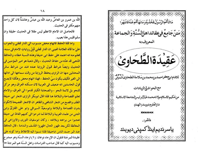 6- ونقل الطحاوي عن الإمام أبي حنيفة رضي الله عنه عقيدته التي أولها : “هذا ذِكرُ بيانِ عقيدةِ أهلِ السنّةِ والجماعةِ على مذهبِ فُقهاءِ المِلّةِ: أبي حنيفةَ النعمانِ ابنِ ثابتٍ الكوفيّ، وأبي يوسفَ يعقوبَ بنِ إبراهيمَ الأنصاريّ، وأبي عبدِ الله محمدِ ابنِ الحسنِ الشيْبانيّ، رِضوانُ اللهِ عليهم أجمعينَ، وما يعتقدونَ من أصولِ الدينِ، ويَدينون بهِ لربِّ العالمين”
