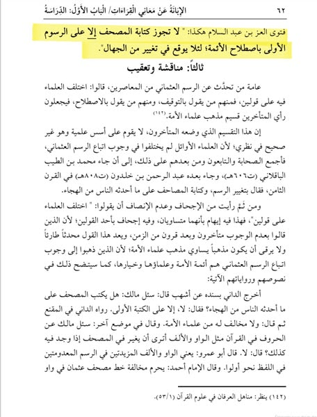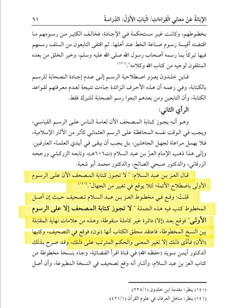 والصواب أن هذه الفتوى قد صحفت عن قصد أو غير قصد على العز بن عبد السلام وأن كلمة (الآن) هي في الأصل تحريف لكلمة (إلا) أقحمت عليها نون فقلبت معناها، ولو أعدنا نص الفتوى على هذا التقرير لصارت (لاتجوز كتابة المصحف إلا علي الرسوم الأولي باصطلاح الأئمة لئلا يوقع في تغيير من الجهال)
