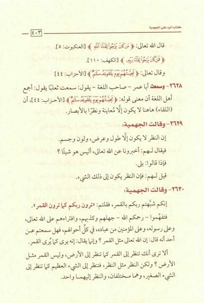 قال ابن بطة في كتاب الإبانة الكبرى : ” وقالت الجهمية إن النظر لا يكون إلا بطول وعرض ولون وجسم، فيقال لهم أخبرونا عن الله أليس هو شيئا ؟! فإذا قالوا بلى قيل لهم فإن النظر يكون لذلك الشيء ” انتهى