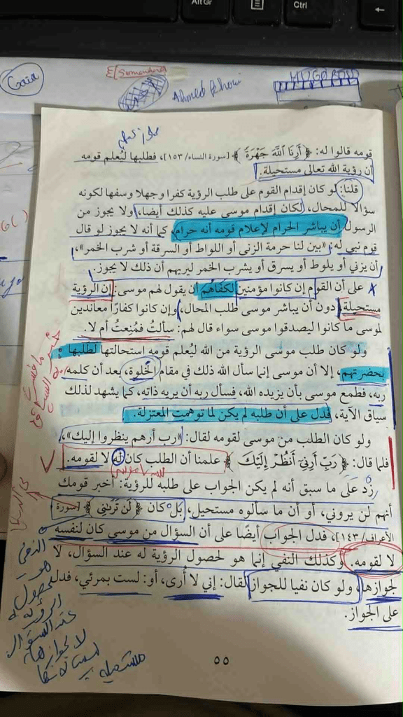 وقال عند تفسير سورة البقرة ءاية 55 {وَإِذْ قُلْتُمْ يَا مُوسَى لَنْ نُؤْمِنَ لَكَ حَتَّى نَرَى اللَّهَ جَهْرَةً فَأَخَذَتْكُمُ الصَّاعِقَةُ وَأَنْتُمْ تَنْظُرُونَ} : …ﻭﺑﻪ ﺗﻌﻠﻢ ﺃﻥ ﻟﻴﺲ ﻓﻲ ﺇﺻﺎﺑﺔ اﻟﺼﺎﻋﻘﺔ ﻟﻬﻢ ﺩﻻﻟﺔ ﻋﻠﻰ ﺃﻥ ﺭﺅﻳﺔ اﻟﻠﻪ ﺗﻌﺎﻟﻰ ﻣﺴﺘﺤﻴﻠﺔ … ﻛﻴﻒ ﻭﻗﺪ ﺳﺄﻝ اﻟﺮﺅﻳﺔ ﻣﻮﺳﻰ ﻋﻠﻴﻪ اﻟﺴﻼﻡ.