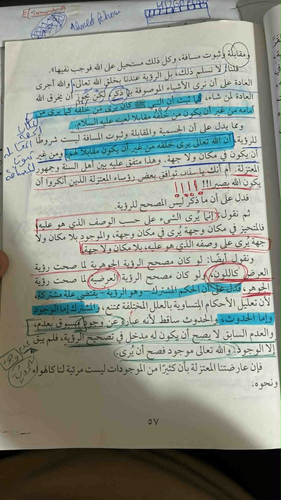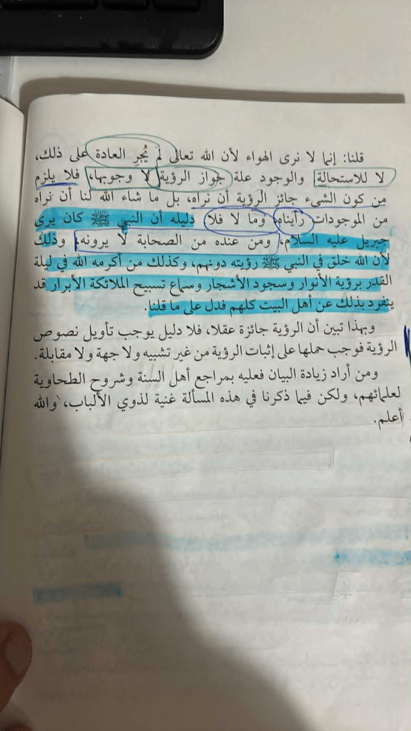قال: “وقد أراد أهل الحق في هذا الدليل العقلي بأن قالوا: إنّا قاطعون برؤية الأعيان والأعراض، ضرورة أنا نعرف بالبصر بين جسم وجسم وبين عرض وعرض، ولا بد للحكم المشترك من مصحح مشترك، وهو إما الوجود أو الحدوث أو الإمكان،إذ لا رابع يشترك بينهما. والحدوث عبارة عن الوجود بعد العدم والإمكان عبارة عن صحة الوجود والعدم، ولا مدخل للعدم في مصحح الرؤية إذ هو لايرى ولامناسبة بينه وبين الرؤية أصلا،فتعين أن المصحح للرؤية هو الوجود، وهو مشترك بين المولى وغيره***نحن نعبر بلفظ اتفاق في اللفظ اختلاف في المعنى***، فيصح أذا أن يُرى الله تبارك وتعالى بلا كيف ولا جهة ولا مقابلة، ولهذا يصح عندنا أن ترى سائر الموجودات من الطعوم والروائح و العلوم والإرادة وغير ذلك وإنما لم نرها لان الله تعالى لم يخلق في العبد رؤيتها بطريق جري العادة لا لأن رؤيتها ممتنعة.