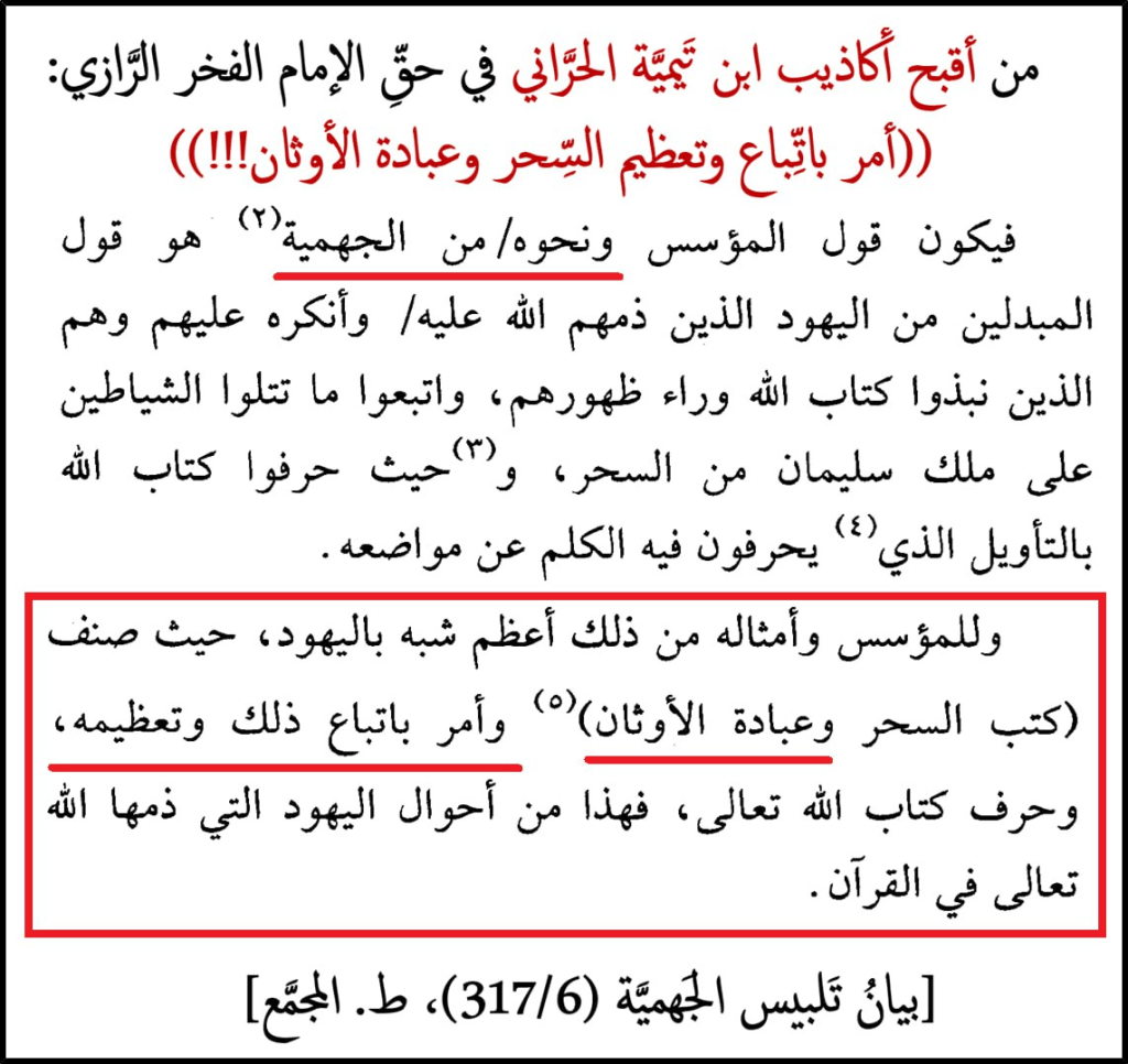 من أقبح أكاذيب ابن تَيميَّة الحرَّاني في حقِّ الإمام الفخر الرَّازي: ((أمر باتِّباع وتعظيم السِّحر وعبادة الأوثان!!!)) [بيانُ تَلبيس الجَهميَّة (6/317)، ط. المجمَّع].
