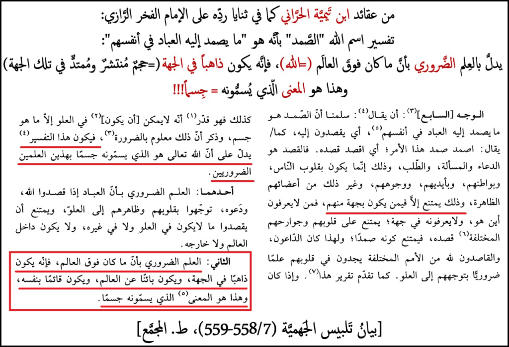من عقائد ابن تَيميَّة الحرَّاني كما في ثنايا ردِّه على الإمام الفخر الرَّازي: تفسير اسم الله “الصَّمد” بأنَّه هو “ما يصمد إليه العباد في أنفسهم”: يدلُّ بالعِلم الضَّروري بأنَّ ما كان فوقَ العالَم (=الله)، فإنَّه يكون ذاهباً في الجهة (=حجمٌ مُنتشرٌ ومُمتدٌّ في تلك الجهة) وهذا هو المعنى الَّذي يُسمُّونه = جِسماً!!!
