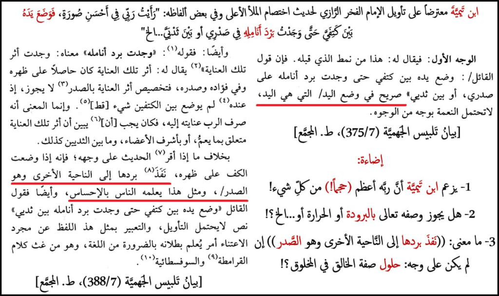 ابن تَيميَّةَ معترضاً على تأويل الإمام الفخر الرَّازي لحديث اختصام الملأ الأعلى وفي بعض ألفاظه: “رَأَيْتُ رَبِّي فِي أَحْسَنِ صُورَةٍ، فَوَضَعَ يَدَهُ بَيْنَ كَتِفَيَّ حَتَّى وَجَدْتُ بَرْدَ أَنَامِلِهِ فِي صَدْرِي أو بَيْنَ ثَدْيَيَّ…الخ”