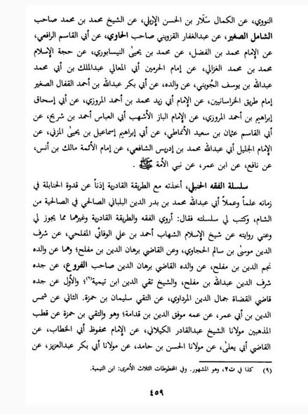 في ما يلي اسناد المحدث محمد سليمان الروداني المتوفى سنة 1094 هجري في الفقه الحنبلي والطريقة القادرية مرورا بابن تيمية، اي قبل ظهور محمد بن عبد الوهاب بحوالي عشرين سنة، والا فقد ولد قرن الشيطان محمد بن عبد الوهاب عام 1115 هجري.