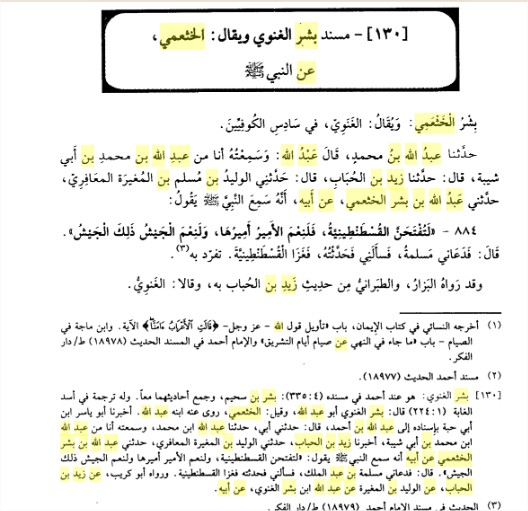 *عبد أو عبيد الله بن بشر الغنوي. والأصح “عبد الله بن بشر” كما ذكر ذلك ابن عدي في معرفة الصحابة ونص عبارته عند ترجمة ابيه “بشر الخثعمي”: أبو عبد الله روى حديثه الوليد بن المغيرة عن عبد الله بن بشر. أخبرنا عبد الرحمن بن يحيى، قَال: حَدَّثَنا أبو مسعود عن زيد بن الحباب عن الوليد بن المغيرة عن عبد الله بن بشر الغنوي، عَن أَبيهِ قال: سمعت النبي صلى الله عليه وسلم يقول «لتفتحن القسطنطينية نعم الأمير أميرها ونعم الجيش جيشها». رواه أبو كريب عن زيد عن الوليد بن المغيرة عن عبيد بن بشر الغنوي، عَن أَبيهِ بطوله والأول أصح”. انتهى