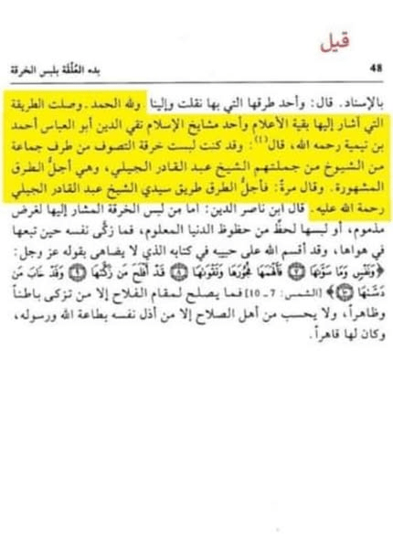 وكون ابن تيمية قد لبس خرقة التصوف في أول عمره مذكور أيضا في رسالة بدء العٌلقة بلبس الخرقة تأليف الحافظ جمال الدين يوسف ابن عبد الهادي الحنبلي المتوفى سنة 909 هـجري، وهو غير محمد بن عبد الهادي المقدسي تلميذ ابن تيمية.