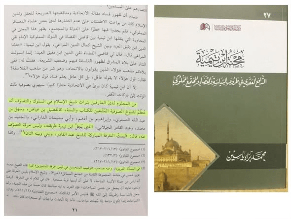 ومما يدل أيضا أن ابن تيمية قد أخذ من علماء الصوفية ما نقله الشيخ ابن رجب الحنبلي في طبقات الحنابلة، حيث قال: “وكان الشيخ تقي الدين ابن تيمية يعظمه ويجله – أي “ابن شيخ الحزامين الصوفي”- ، ويقول عنه: هو جنيد وقته. وكتب إليه كتاباً من مصر أوله “إلى شيخنا الإِمام العارف القدوة السالك”. انتهى
