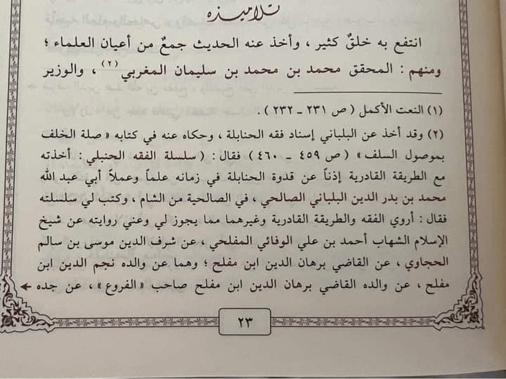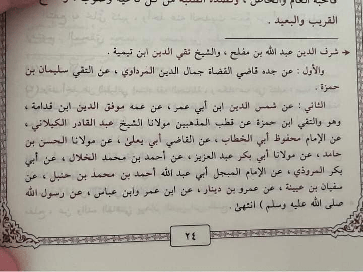 وذكر في السند أعلام المذهب وكباره، ومنهم الحجاوي وابن مفلح وابن تيمية وابن أبي عمر والموفق ابن قدامة، وغيرهم.