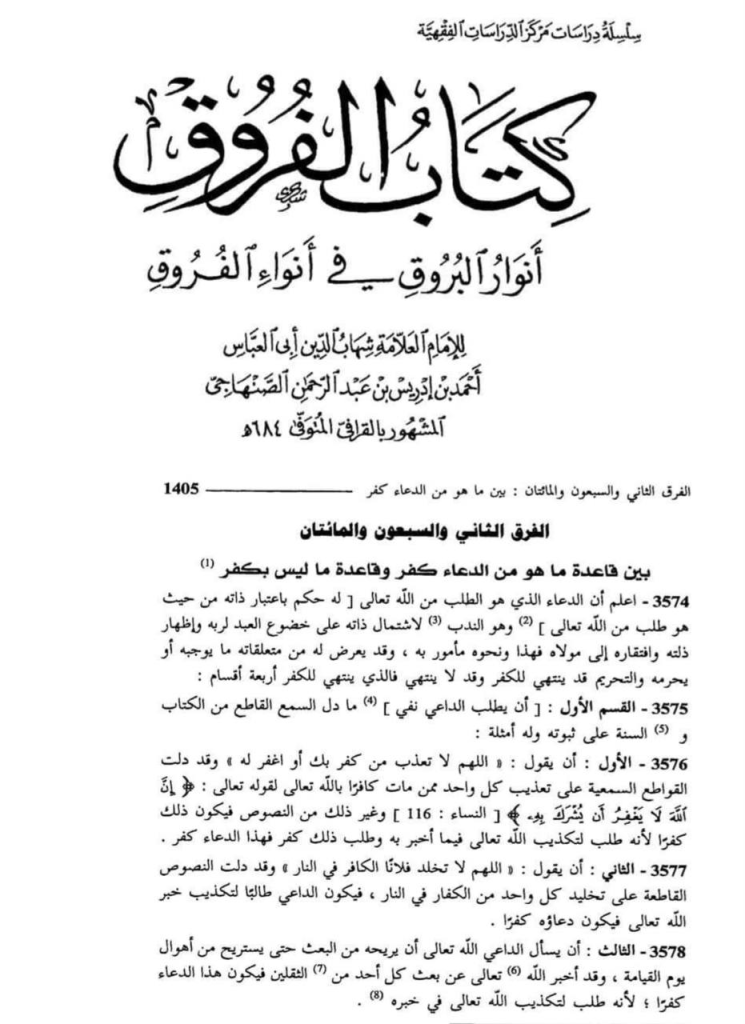 القسم الأول: أن يطلب الداعي نفي ما دل السمع القاطع من الكتاب والسنة على ثبوته، وله أمثلة: الأول: أن يقول: اللهم لا تعذب من كفر بك، أو اغفر له، وقد دلت القواطع السمعية على تعذيب كل واحد ممن مات كافرًا بالله تعالى؛ لقوله تعالى: إن الله لا يغفر أن يشرك به {النساء: 48}، وغير ذلك من النصوص، فيكون ذلك كفرًا؛ لأنه طلب لتكذيب الله تعالى فيما أخبر به، وطلب ذلك كفر، فهذا الدعاء كفر. اهـ.