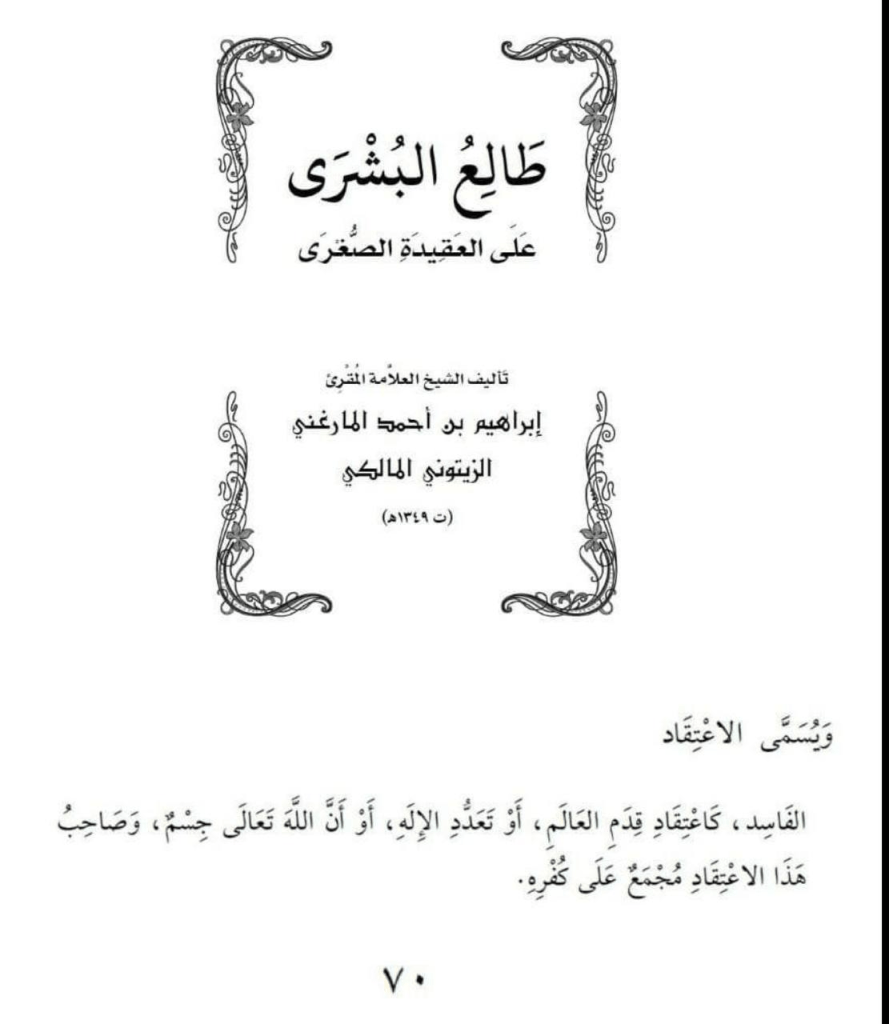 قال شيخ جامع الزَّيتونة إبراهيم المارغني التُّونُسيُّ في [طالع البُشرَى على العقيدة الصُّغرَى] ما نصُّه: “ويُسمَّى الاعتقاد الفاسد كاعتقاد قدم العالم أو تعدُّد الإله أو أنَّ الله تعالَى جسم، وصاحب هذا الاعتقاد مُجمع على كُفره” اهـ