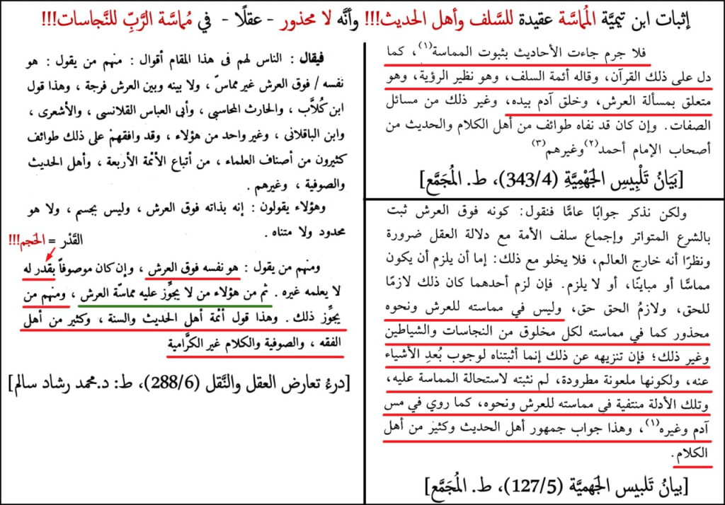 (إثباتُ ابنِ تيميَّة المُماسَّة عقيدة للسَّلف وأهل الحديث!!!، وأنَّه لا محذور – عقلًا – في مُماسَّة الرَّبِّ للنَّجاسات!!!)1