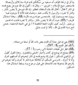 وهذا كلام فاسد لأن مشيئة الله وقدرته لا تتعلق بصفاته حتى يضع أحد صفاته في النار وإلا فهذا يلزم منه نسبة التغير والتركيب والحدوث لله، ويلزم منه أيضا أن القدم جارحة أو جزء منه ، وهذا تجسيم صريح، تعالى الله عن ذلك علو كبيرا.