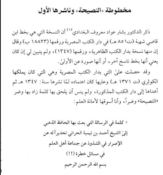 وقدألحق الدكتور صلاح الدين المنجد النصيحة بكتابه المسمى “شيخ الإسلام ابن تيمية سيرته وأخباره عند المؤرخين”، وقال مُعلّقاً عليها : “شك بعضهم في نسبة هذه النصيحة للذهبي, ولا شك عندنا أنها له, فقد نقلت مخطوطاتها من خط الذهبي, و لم يُنكرها أحد من العلماء الذين نقلوها كتقي الدين بن قاضي شبهة و غيره. ثم إن هذا أُسلوب الذهبي عندما يُهاجم,و يبدو أنه كتبها في آخر عمره”. انتهى