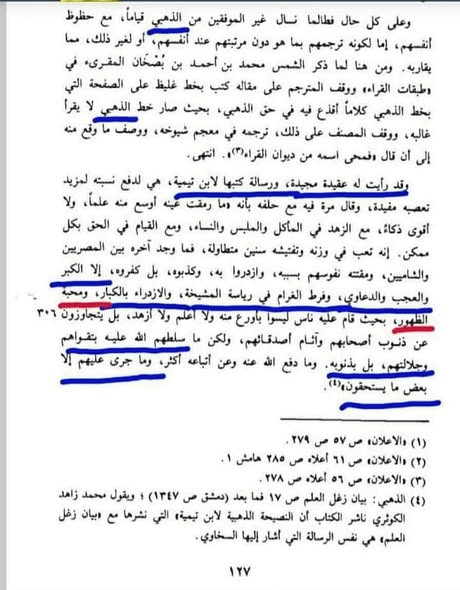 ومن جملة ما يقوله الذهبي في حق ابن تيمية ما نقله الحافظ ابن حجر العسقلاني في ” الدرر الكامنة ” عنه ونصه: ” وأنا (أي الذهبي) لا أعتقد فيه عصمة بل أنا مخالف له في مسائل أصلية وفرعية “.