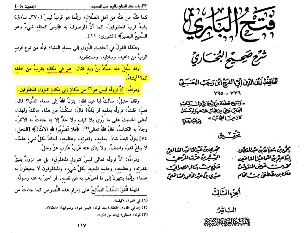 بل ثبت عن ابن رجب في موضع ٱخر أنه فسر كلام حماد بن زيد فقال: “ومراده أن نزوله ليس هو انتقال من مكان إلى مكان كنزول المخلوقين”. انتهى