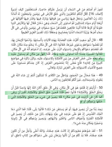 وجاء أيضا في الرد على الجهمية المنسوب لأبي سعيد عثمان الدارمي قوله : “أَقَرَّتْ هَذِهِ الْعِصَابَةُ بِهَذِهِ الْآيَاتِ بِأَلْسِنَتِهَا، وَادَّعَوَا الْإِيمَانَ بِهَا، ثُمَّ نَقَضُوا دَعْوَاهُمْ بِدَعْوَى غَيْرَهَا، فَقَالُوا: اللَّهُ فِي كُلِّ مَكَانٍ، لَا يَخْلُو مِنْهُ مَكَانٌ. قُلْنَا: قَدْ نَقَضْتُمْ دَعْوَاكُمْ بِالْإِيمَانِ بِاسْتِوَاءِ الرَّبِّ عَلَى عَرْشِهِ، إِذِ ادَّعَيْتُمْ أَنَّهُ فِي كُلِّ مَكَانٍ. فَقَالُوا: تَفْسِيرُهُ عِنْدَنَا: أَنَّهُ اسْتَوْلَى عَلَيْهِ وَعَلَاهُ. قُلْنَا: فَهَلْ مِنْ مَكَانٍ لَمْ يَسْتَوْلِ عَلَيْهِ وَلَمْ يَعْلُهُ حَتَّى خَصَّ الْعَرْشَ مِنْ بَيْنِ الْأَمْكِنَةِ بِالِاسْتِوَاءِ عَلَيْهِ، وَكَرَّرَ ذِكْرَهُ فِي مَوَاضِعَ كَثِيرَةٍ مِنْ كِتَابِهِ؟ فَأَيُّ مَعْنًى إِذًا لِخُصُوصِ الْعَرْشِ إِذْ كَانَ عِنْدَكُمْ مُسْتَوِيًا عَلَى جَمِيعِ الْأَشْيَاءِ كَاسْتِوَائِهِ عَلَى الْعَرْشِ تَبَارَكَ وَتَعَالَى. هَذَا مُحَالٌ مِنَ الْحُجَجِ، وَبَاطِلٌ مِنَ الْكَلَامِ”. انتهى
