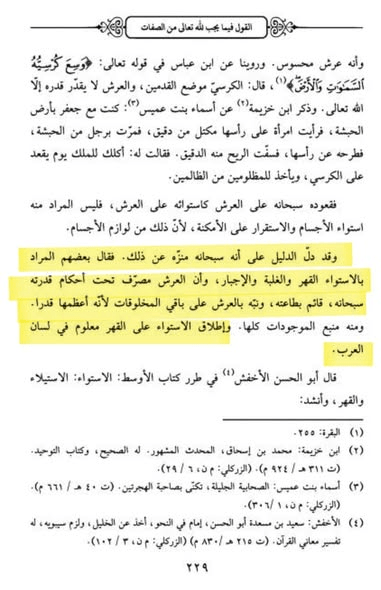 “وقد دلّ الدليل على أنه سبحانه منزّه عن ذلك. فقال بعضهم: المراد بالاستواء القهر والغلبة والإجبار، وأن العرش مصرف تحت أحكام قدرته سبحانه، قائم بطاعته، ونبّه بالعرش على باقي المخلوقات لأنه أعظمها قدرًا.” انتهى.